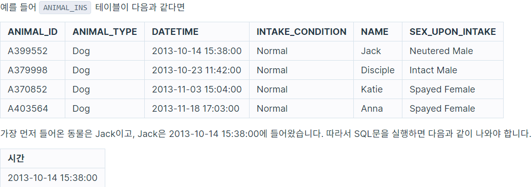 동물 보호소에 가장 먼저 들어온 동물은 언제 들어왔는지 조회하는 SQL문을 작성해주세요.