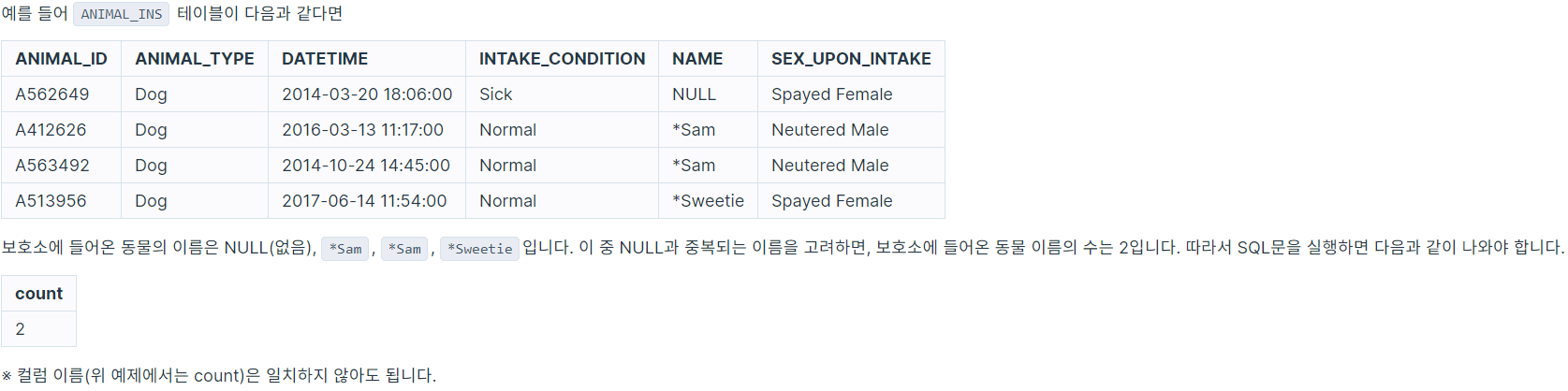 이때 이름이 NULL인 경우는 집계하지 않으며 중복되는 이름은 하나로 칩니다.