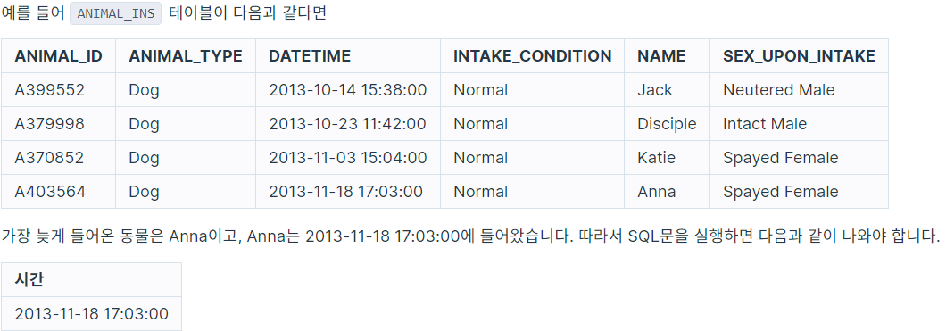 가장 최근에 들어온 동물은 언제 들어왔는지 조회하는 SQL문을 작성해주세요.