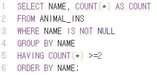 동물 보호소에 들어온 동물 이름 중 두 번 이상 쓰인 이름과 해당 이름이 쓰인 횟수를 조회하는 SQL문을 작성해주세요.