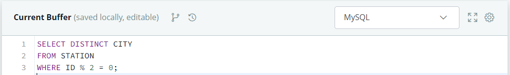 Query a list of unique CITY names with even ID numbers.