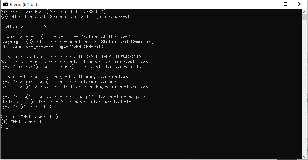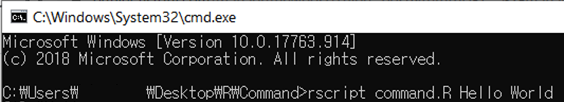 1. 코드 작성 (command.R) - commandArgs( ) 함수를 통해 커맨드 창에서 입력한 값을 가져와 R 코드 내에서 사용 가능 - 첫번째 입력과 두번째 입력을 출력하는 간단한 코드 2. 코드 실행 - ".R" 파일이 저장되어 있는 폴더 검색창에 cmd를 입력하여 해당 경로에서 간단하게 커맨드 창 실행 - 파일명에 공백이 포함되면 커맨드 창에서 실행 불가 - rscript 파일명 args[1] args[2] - Hello가 args[1], World가 args[2]에 저장되어 출력되는 것을 확인